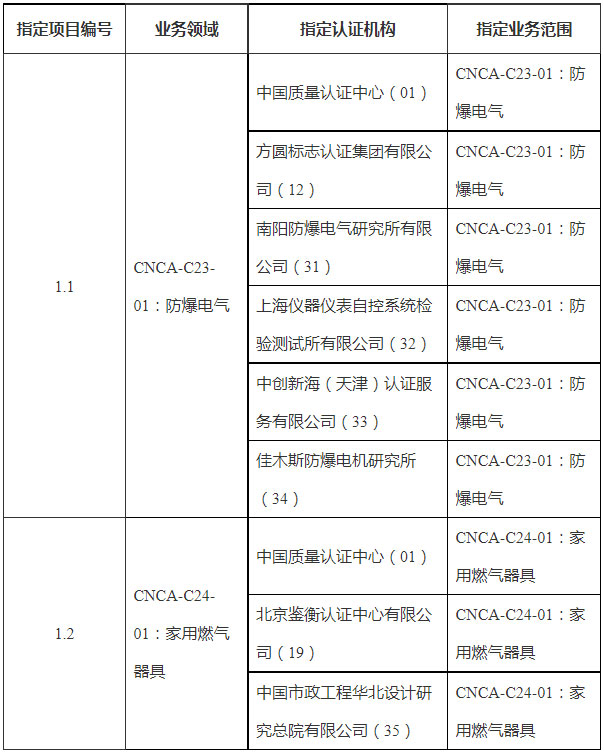 二、防爆電氣、家用燃?xì)馄骶叩犬a(chǎn)品強(qiáng)制性產(chǎn)品認(rèn)證實(shí)施機(jī)構(gòu)指定決定
